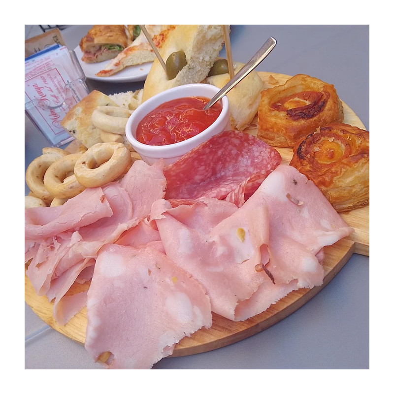 Aperitivo con drink alcolico e tagliere con prodotti gastronomici del territorio.