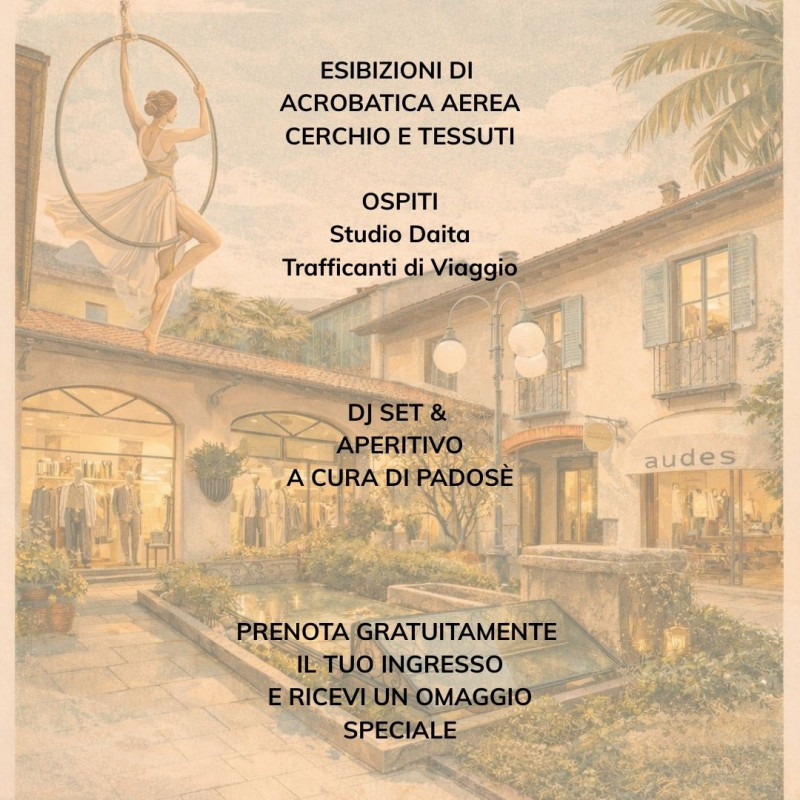 Dalle ore 16.00 alle 19.30 sfileranno le collezioni primaverili dei negozi di abbigliamento GLÖED men, Récolte Vintage, Audes e Reve, ci saranno emozionanti spettacoli di danza aerea con dj set e sarà servito un aperitivo a cura del locale Padosè.
