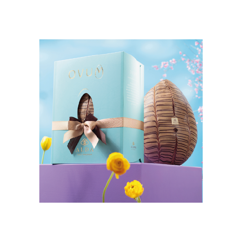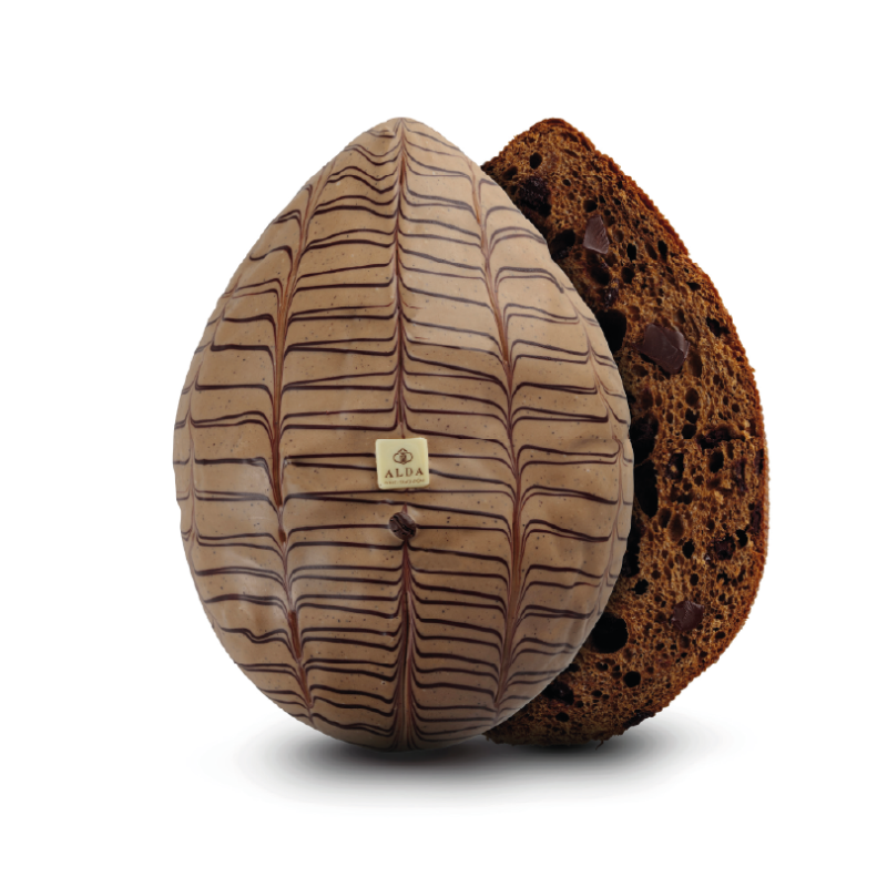 Ovum Alda Cappuccino Salentino (500g), prodotto dolciario da forno a lievitazione naturale, impasto al caffè con cubetti di cioccolato fondente. Ricoperto di cioccolato bianco e crema di mandorle pugliesi.
