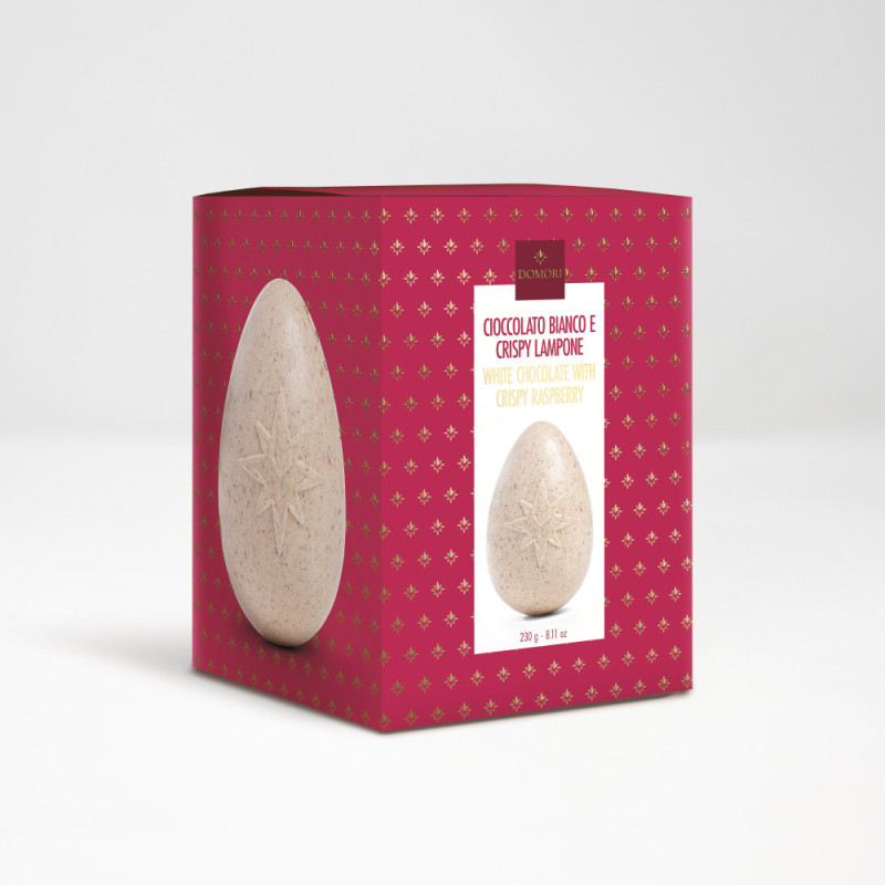 Uovo di cioccolato bianco e lamponi dal sapore avvolgente, con all'interno una sorpresa speciale.